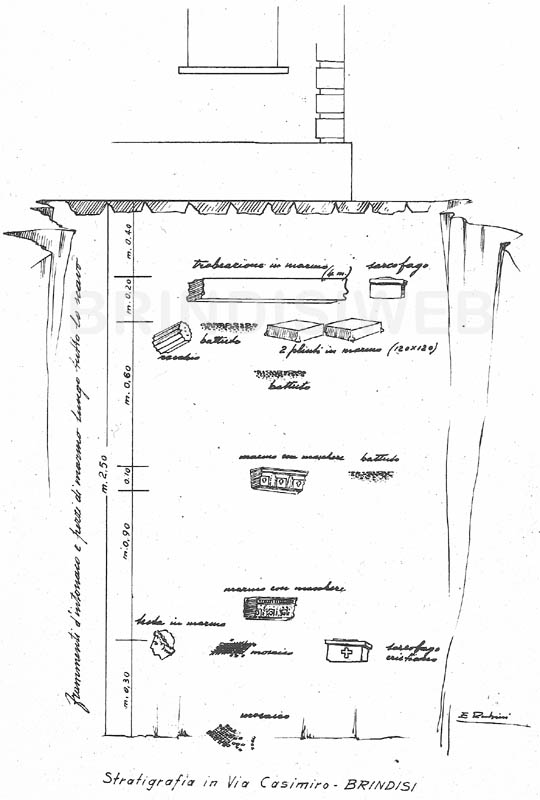 Nel terreno di riporto dello scavo furono rinvenuti numerosi frammenti d’intonaco (probabilmente di pareti decorate), di anfore e lucerne, frammenti marmorei3 ed una testa in marmo di età antonina (98 – 180 d.C.) attribuita ad Antinoo4, il giovane greco dalla singolare bellezza proveniente della Bitinia, odierna Turchia, amato dall’imperatore Adriano, oggi custodita nel deposito del Museo Nazionale di Taranto.