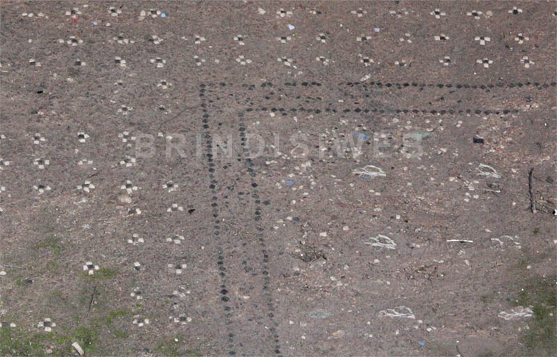 I pavimenti visibili sul lato a ovest, in corrispondenza del cancelletto d’ingresso, consistono in coccio pesto decorato da scaglie (scutulae) bianche a forma irregolare e da scaglie colorate, disposte su file regolari. Sono riquadrati da una soletta in cemento che ne rettifica i limiti1.