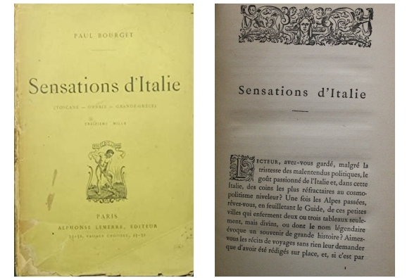 Grande appassionato dell’Italia, si considerava senese di adozione, Bourget tra il 15 e il 28 novembre del 1890 visitò la Puglia, giungendo a Foggia in treno da Ancona, dopo aver visitato la Toscana, l’Umbria e le Marche, prima di proseguire per Metaponto, Crotone e Reggio Calabria. Della sua lunga ed interessante escursione autunnale nella penisola, accompagnato dalla giovane sposa Minnnie David, ci rimane l’opera di notevole rilevanza letteraria e critica “Sensations d’Italie”, il suo diario di viaggio pubblicato l’anno successivo a Parigi, un volume successivamente tradotto in italiano perdendo però, secondo l’opinione di alcuni studiosi, gran parte del suo fascino.