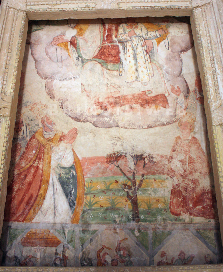 Il frammento d’affresco che è nella chiesa, ritenuto protoduecentesco, è evidente relitto della primitiva costruzione; avuto riguardo alle descrizioni che pur si hanno relative alla distribuzione degli altari fra XVII e XVIII secolo, va sottolineata l’ostentata riproposizione, su quello che era 1’altar maggiore, di questa che è una rappresentazione mariana ascrivibile al tipo iconografico della Vergine affettuosa, in chiave devozionale.