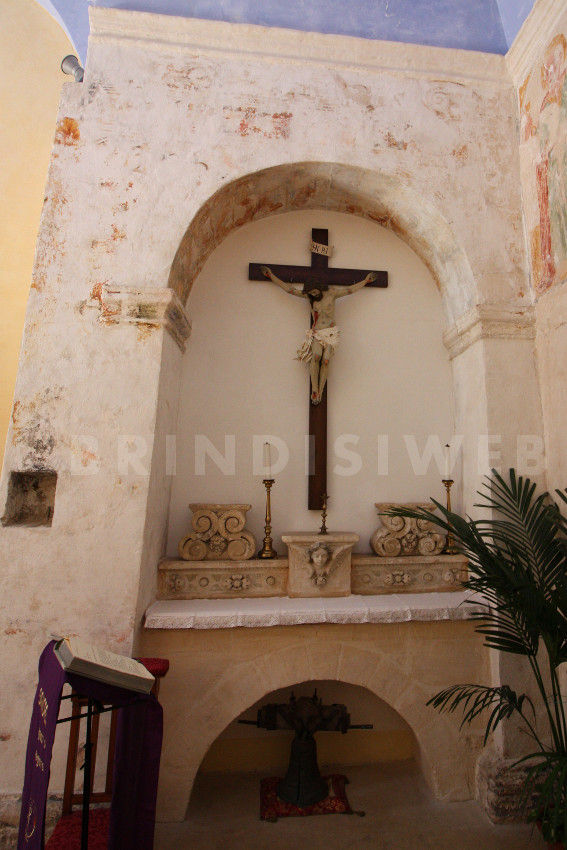 In controfacciata è un’ acquasantiera lapidea, a muro, databile al tardo ‘500 o ai primi del ‘600, dalla vasca circolare ornata da baccellature. Sull’attuale parete di fondo un altare in pietra sei – settecentesco, attuale altar maggiore, in un’ ampia arcata ricavata nel muro, in cui pure sono collocate le rappresentazioni scultoree di due cherubini a figura intera, conserva una decorazione pittorica più antica tardo cinquecentesca o dei primi del seicento, raffigurante una Madonna del Rosario. Tale rappresentazione, chiaro rimando alla battaglia di Lepanto, interdetta alla vista dagli interventi settecenteschi, è stata recuperata nel 1982; così è descritta da Marco Fina: