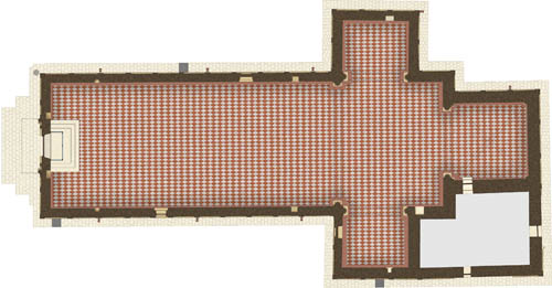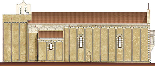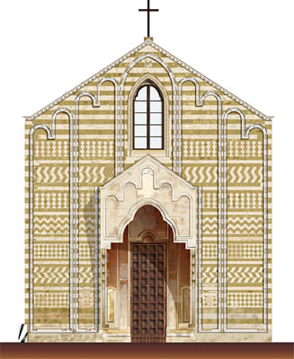 Le fiancate sono scandite anch’esse da lesene saldantesi in alto agli archetti trilobi.