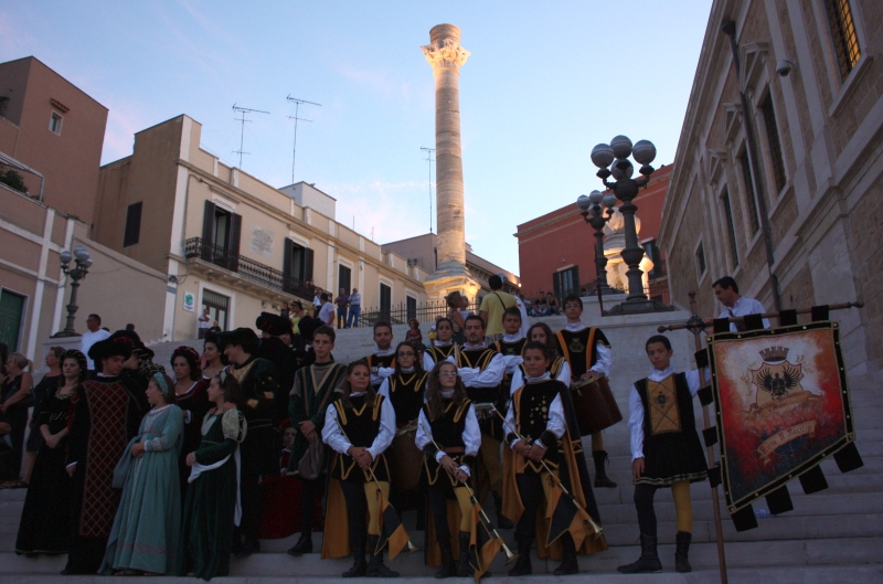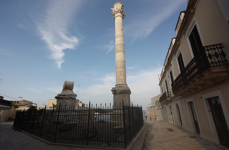 Inoltre, un bellissimo torso loricato – ora nel Museo Archeologico Provinciale – fu rinvenuto nel 1932 in via Tarantini, durante uno scavo: dalla ricchezza dei fregi ornamentali della corazza potrebbe trattarsi di un simulacro dello stesso Traiano, a significare i profondi legami tra l’Imperatore e la nostra città. Infine, non si può sottacere il fatto che nel 29 a. C. il Senato romano decretò, a ricordo della vittoria di Ottaviano ad Azio di due anni prima, l’erezione di due archi di trionfo, uno a Roma e l’altro a Brindisi, a ulteriore dimostrazione che Roma era particolarmente generosa quando si trattava di celebrare – con monumenti – vittorie e opere pubbliche. È noto che al tempo dell’Impero, Brindisi fu forse il più importante nodo stradale; e nel nostro porto, attivissimo già agli inizi del II sec. a. C., Augusto teneva stabilmente un’intera flotta. A Roma ha peraltro resistito alle ingiurie del tempo la splendida colonna Traiana, che celebra le conquiste dell’Imperatore.