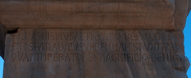 ILLUSTRIS PIVS ACTIB. ATQ: REFVLGENS – PTOSPATHA LVPVS VRBEM HANC STRVXIT AB IMO – QVAM IMPERATORES MAGNIFICIQ: BENIGNI … (L’illustre e pio per azioni benefiche Lupo Protospata ricostruì dalle fondamenta questa città, che gli Imperatori magnifici e benigni …) L’epigramma continuava con ogni probabilità (e logica) sulla base della seconda colonna, troppo presto deterioratasi: dei caratteri non è rimasto neppure il ricordo.