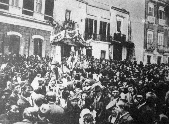 La processione equestre percorreva le strade che conducono sul lungomare. Qui durante il periodo della guerra del 1915-18 – quando il porto era affollato di navi militari – alla cerimonia della benedizione eucaristica, la flotta rispondeva con ventuno salve di artiglieria.