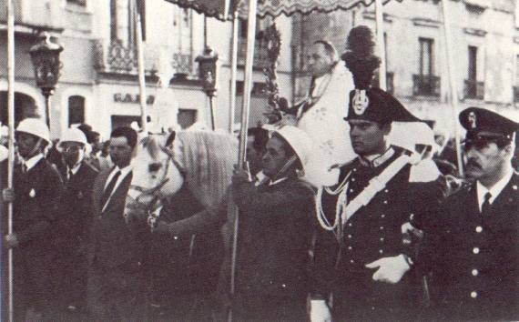 La solenne processione del Corpus Domini prendeva via da piazza Duomo, gremita di fedeli, e precisamente dall’ingresso del Palazzo del Seminario, dove L’Arcivescovo di Brindisi-Ostuni sulla groppa di un cavallo bianco “parato”, viene accompagnato dal clero, dalle autorità locali civili e militari e dai rappresentanti dell’Ordine dei Cavalieri di Malta (Ospedalieri) e dell’Ordine Equestre del Santo Sepolcro di Gerusalemme che reggono le sei aste del baldacchino.