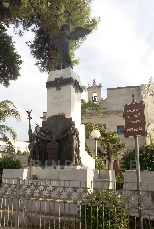 Alle spalle del Santuario, sulla bella piazzetta dove spicca la facciata posteriore della chiesa, sorgono due colonne del XVIII secolo sul quale sono poste le statue di Santa Lucia e di Sant’Irene. Al centro della piazza spicca la statua della Vittoria del Monumento ai Caduti della Prima Guerra Mondiale, inizialmente collocata a Brindisi e nell’aprile del 1927 acquistata dall’Amministrazione Comunale di Erchie per la somma di 70.000 lire. Qui fu. inaugurata il 4 novembre 1928.