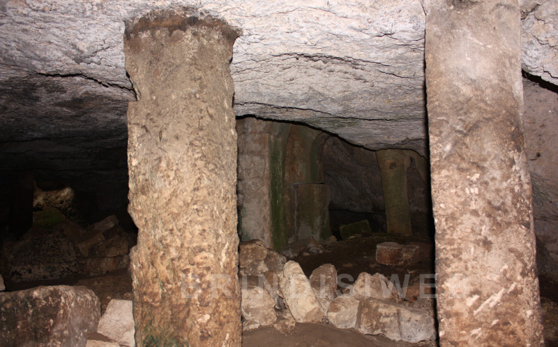 L’ingresso è scavato nella roccia ed è limitato in alto da mura megalitiche, coperte da pietre ad arco.
