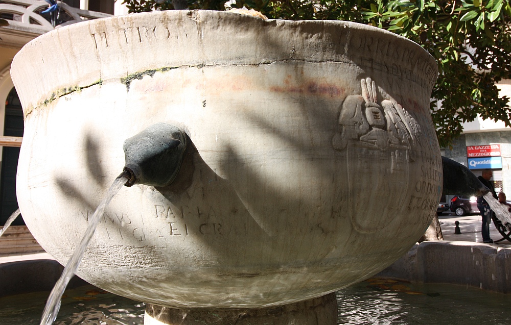 Un’altra scritta latina è risalente al 1792. Sullo stelo mediano al centro della vasca dal quale sgorga l’acqua, si può notare ciò che rimane dello stemma dell’allora sovrano Filippo III di Spagna, ovvero uno scudo racchiuso in un cordone e sormontato da tre elmi, purtroppo deteriorato dal tempo e dallo scorrere dell’acqua. Una volta lo stelo terminava con un capitello ed era cinto da una corona reale.