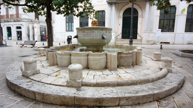 L’unica superstite è quella che riporta il nome del governatore De Torres, realizzata con il reimpiego di antichi materiali al centro della piazza ubicata “tra le due collinette sopra le quali sorge Brindisi”. L’antica fontana è costituita da due vasche marmoree, quella inferiore è racchiusa in una sorta di corolla fatta con mezze giare tagliate verticalmente e rinforzate da pezzi di colonnine, dove si raccoglie l’acqua che zampilla dalle quattro bocche in bronzo, a forma di testa di cavallo, incastonate nella vasca superiore. Questa, più piccola, è un fonte battesimale che potrebbe provenire da San Giovanni al Sepolcro, ritenuto il battistero della Cattedrale nel XII secolo (scheda). La sua forma trova infatti riscontro in una importante raffigurazione miniata presente in una delle pergamene liturgiche risalenti al X-XIII sec. conservate nel Museo Diocesano di Bari, dov’è rappresentato un fonte battesimale dell’arte locale dell’XI secolo.