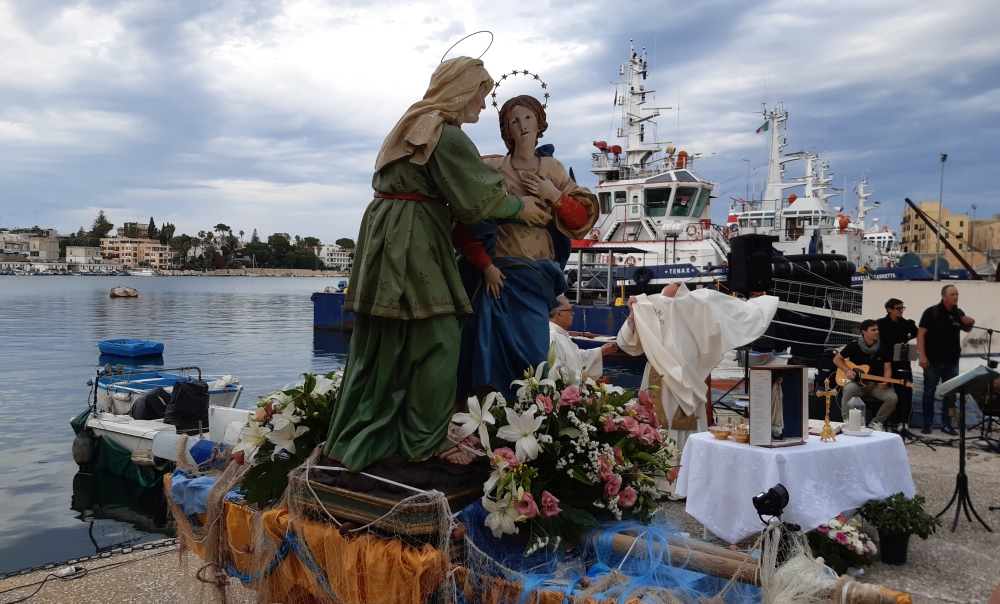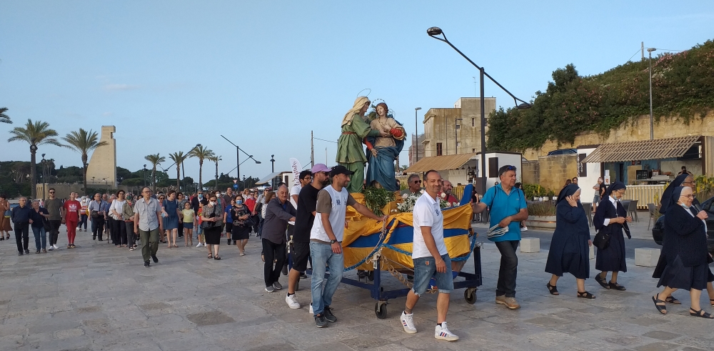 Proprio qui generazioni di fieri e coraggiosi pescatori, persone semplici ma tanto operose, hanno devotamente tramandato il culto devozionale alla Vergine Maria e Santa Elisabetta, le protettrici delle partorienti, rappresentate nel simulacro della Visitazione che veniva portato in processione all’inizio dell’estate. L’opera in legno riproduce la visita fatta dalla Madonna alla cugina, rimasta incinta in età avanzata, dopo aver ricevuto l’annuncio che sarebbe diventata la madre di Gesù per opera dello Spirito Santo. Il Vangelo di Luca racconta che il 31 maggio Maria partì frettolosamente da Nazareth per recarsi ad Ain-Karim, la cittadina della Giudea a circa 6 km da Gerusalemme, e restò con l’anziana parente nell’ultimo periodo di gravidanza per aiutarla e prestarle servizio sino ad otto giorni dopo la nascita del figlio Giovanni, il futuro Battista. In quell’occasione Maria pronunciò il Magnificat, il canto di preghiera e di lode al Signore in quanto “nulla è impossibile a Dio!”. La tradizione religiosa vuole siano stati i padri francescani ad originare la festa a ricordo dell’incontro tra le due cugine: i frati minori la celebravano il 2 luglio, giorno ricorrente il termine della visita, già nel 1263. Nello stesso giorno di ogni anno il gruppo scultoreo da sempre conservato all’interno della Basilica Cattedrale di Brindisi, dedicata proprio della Visitazione e a San Giovanni Battista, veniva portato a spalla sino al cuore del rione marinaro più antico della città, probabilmente come omaggio e ringraziamento per essere fonte di una speciale grazia. Non si hanno notizie certe dell’origine di questa tradizione religiosa che si teneva a Brindisi, così come avveniva e continua ad essere celebrata in alcune località salentine e dell’Italia centro-meridionale (Gallipoli, Salice Salentino, Molfetta, Enna e Loano quelle più note), in alcuni di questi paesi la Vergine Santissima della Visitazione è anche riconosciuta come la patrona dei pescatori locali
