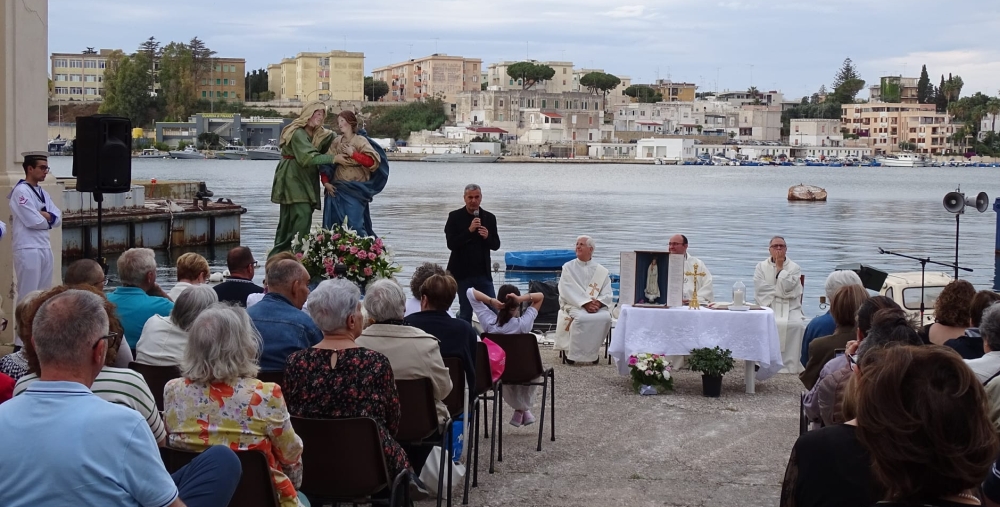 Rarissime sono le fonti a cui poter attingere notizie storiche, anche tra i più anziani “sciabicoti” ancora in vita non è stato semplice trovare una reminiscenza personale di questa remota processione, solo in una poesia in vernacolo di Francesco Libardo, pubblicata nel volume “L’oru ti Brindisi”, si trova una fugace descrizione del rito popolare e si percepisce la profonda devozione degli abitanti del quartiere per “la Matonna ti li piscaturi”. Il fine poeta dialettale nonché profondo cultore delle tradizioni marinare locali, nei suoi versi nostalgici fa rivivere la bella processione del due di luglio, quando la statua veniva condotta alle Sciabiche per restarci tutta la notte, sistemata all’interno di una apposita nicchia, al fianco della quale vigilavano una coppia di “beatelli”. Prima del passaggio del simulacro veniva accesa l’illuminazione “a carburiu” su quattro archi, poi durante la grande festa venivano esplosi fuochi d’artificio, “rotapacci e fisckaruli”, non potevano mancare le bancarelle di fave secche, scapece (piccoli pesci fritti e marinati a strati alterni con mollica di pane imbevuta con aceto e zafferano), noci, castagne cotte al forno e “cornuli” (i baccelli dolci dei carrubi). Per l’occasione il “priore della Chiesa Madre” raccoglieva le offerte dei fedeli, soprattutto quelle donate dai pescatori che uscivano in barca con la lampara, essi lasciavano anche un quarto del guadagno della pesca notturna. L’antico rituale venne interrotto con lo scoppio del secondo conflitto mondiale, poi negli anni ’50 il parroco della Cattedrale don Giuseppe Cavaliere tentò di ripristinare l’evento, promuovendo il gruppo “Pia Unione”, senza però riuscirci. La cerimonia, infatti, si tenne solo quell’anno e non ebbe alcun seguito. Di quell’evento resta solo una bella immagine d’epoca nella quale si vede un folto gruppo di pescatori in posa sorridente ed allegra sul molo delle Sciabiche, con al centro il sacerdote. Con il contributo dei social media si è riusciti a individuare buona parte dei loro nomi, compresa la ‘ngiuria (il soprannome): Premiu para para, Luigi lu casciulu, Cocu banana, Ucciu llalla, Tunatu ti ‘nacchia, Chiccu lu cinesi, Vitucciu bambolina, Aldo settigiacchetti, Luigi lu rapinu, Rafeli pezza ti cantru, Cocu muloni, Giuvanni la cima, Ninu ti pirucca e altri ancora. Una volta trasferiti sulla sponda opposta del porto, i pescatori di Brindisi hanno continuato ad invocare la Vergine Maria come loro guida e protettrice, celebrando la festa dell’Ave Maris Stella.
