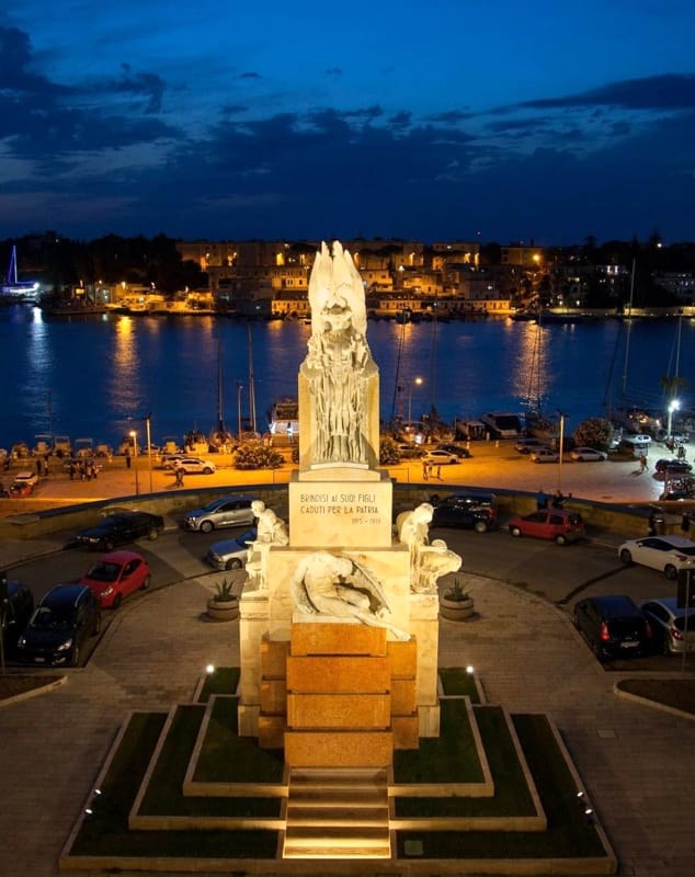 La scelta dell’ubicazione finale doveva “essere ritenuta più idonea rispetto il carattere e le proporzioni di essa opera monumentale”, un dibattito durato anni e che vedeva da una parte i sostenitori di piazza Cairoli, come l’on. Ugo Bono, e chi invece riteneva più opportuno collocare l’opera nella piazza antistante la stazione ferroviaria (oggi piazza Crispi) e chi ancora proponeva il largo Belvedere, all’incrocio tra l’attuale Corso Roma con via Indipendenza, tra la chiesa della Pietà e il costruendo Liceo Classico. La ricca documentazione disponibile presso l’Archivio di Stato di Brindisi racconta che fu proprio quest’ultima indicazione ad essere approvata nel settembre del 1928, una scelta che però venne duramente contestata dallo scultore in una durissima lettera inviata da New York, dove si era trasferito l’anno precedente, al podestà di Brindisi Serafino Giannelli, dove definisce “assolutamente cervellotica” tale scelta.