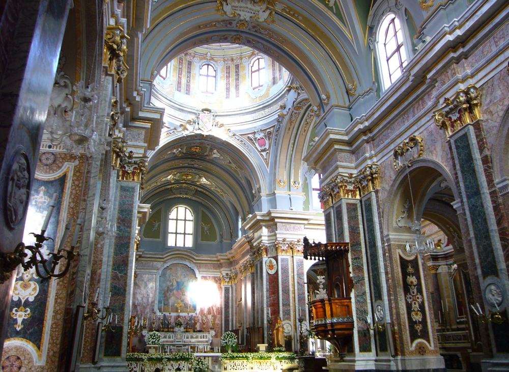 Davvero suggestiva è la piazza sul quale si affaccia il Duomo che permette una vista panoramica sul paese e gustare lo stile barocco della Cattedrale di Santa Maria Assunta in Cielo, riedificata nel 1750 sull’originale medievale. Elevata a Basilica Pontificia Minore nel 1992, si presenta con una elegante facciata in carparo dove si aprono l’ampio finestrone centrale e i tre portali d’ingresso. La bella ed alta cupola rivestita in maioliche colorate svetta sulla chiesa e la rende visibile da ogni parte della città. L’interno è a croce latina a tre navate, molto ricca nelle decorazioni: marmi policromi, oro zecchino, ricchi arredi, candelabri bronzei, stucchi, tele e statue del ’600 (tra cui i “Santi Medici” di scuola veneziana e di “San Barsanofio” di scuola napoletana) riempiono ogni spazio e le cappelle laterali.