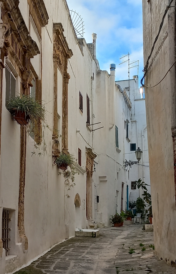 Addentrarsi nel suo cuore, meglio se guidati, si rivela un’esperienza necessariamente ricca di emozione, come diversamente non potrebbe essere, passando tra angusti viottoli spesso lastricati a chianche, tra le case bianche dell’umile volgo d’un tempo ed i palazzotti signorili dai bellissimi e decorati portali, con araldiche, colonne, decorazioni, architravi, mensole e loggiati che arricchiscono questi eleganti palazzotti di stile rinascimentale o rococò di particolari eterni e silenziosi della pietra. Nel silenzio dei vicoli si incrociano terrazze dalla cui altura si gode d’una visuale mozzafiato verso il vicino mare.