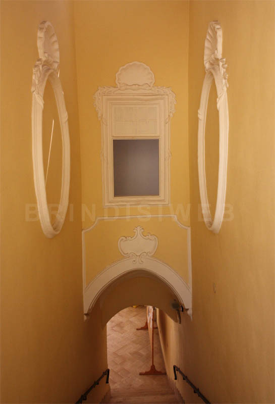 Al piano superiore, secondo un documento del 1814, vi era la sala detta “Galleria antica” e diverse altre camere, tra cui quella dove morì il De Leo e quella utilizzata come libreria. Al momento questi ambienti sono utilizzati come uffici comunali. E’ stata conservata la piccola cappella racchiusa dall’originale porta in legno con all’interno un altare in pietra e un soffitto a botte finemente decorato.