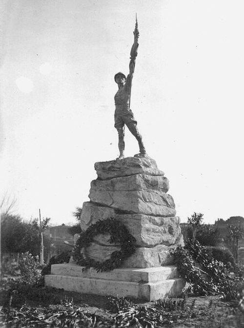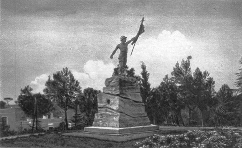 Al centro del parco fu innalzato un Monumento ai Caduti brindisini della grande guerra che “recava in cima a una rupe un milite che incede risoluto impugnando con la sinistra l’asta della bandiera” (M. Guastella), un’opera dal valore patriottico che fu scelta al posto della Vittoria Alata realizzata da Vito De Bellis, che quindi doveva essere collocare in piazza della Vittoria, che però fu rifiutata dal Comune di Brindisi e prontamente venduta a Erchie, dove tutt’oggi è installata. La statua del milite non ebbe i consensi attesi e fu a sua volta sostituita, in via definitiva, dal monumento realizzato da Edgardo Simone posto in piazza Santa Teresa.