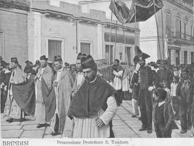 In passato san Teodoro veniva celebrato due volte l’anno, il 9 di novembre a ricordo del martirio, e il 27 aprile giorno della traslazione da Euchaita. Secondo la tradizione più remota quest’ultima circostanza risalirebbe al 1210 o più probabilmente al 1225, in occasione delle nozze di Federico II di Svevia con Isabella di Brienne, regina di Gerusalemme, celebrate il 9 novembre nella Cattedrale di Brindisi. In entrambe le ricorrenze le reliquie venivano portate “processionalmente per la città con il concorso de’ cittadini tutti, e forastieri” (A. Della Monaca). Nella Cronaca dei Sindaci di Brindisi sono registrate scrupolosamente le volte in cui i festeggiamenti civili e religiosi in onore del santo non avvenivano o si verificavano in modo differente dal solito, come accadde il 27 aprile del 1698, quando un forte acquazzone che durò l’intera giornata non permise lo svolgimento della processione, “ma solamente si fece d’intorno la chiesa dell’arcivescovato”. Nell’aprile del 1727 si svolse solo il rito religioso in cattedrale, mentre tre eminenti cittadini, Teodoro Sala, Tommaso Cantamessa e Domenico Sciurbi, organizzarono una sfilata con circa sessanta persone a cavallo, armati di “carrubini” e pistole, che sfilarono ben vestiti in città, ottenendo un’ottima impressione tanto che la processione “a gloria del nostra santo, riuscì più bella delle altre volte”. I sacrestani della cattedrale ebbero in elemosina olio così da poter illuminare la piazza e le vie circostanti, e denaro per comprare la polvere da sparo per i cento mortaretti “con molti folgoroni”, esplosi poi la sera.