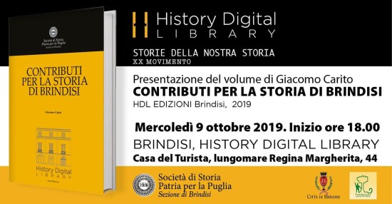 La Società di Storia Patria per la Puglia, sez. di Brindisi, in uno con la Fondazione Tonino Di Giulio, presenta, mercoledì 9 ottobre 2019 alle ore 18.00, il libro Contributi per la storia di Brindisi di Giacomo Carito, presso Casa del Turista, Lungomare Regina Margherita, 44 Brindisi.