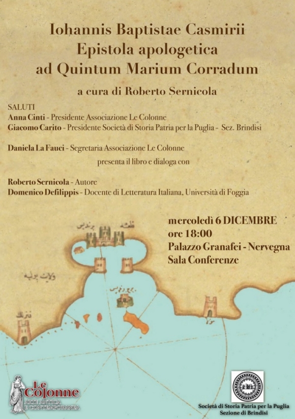 Alla presentazione interverranno la presidente dell’associazione Le Colonne Anna Cinti e il presidente della Società di Storia Patria per la Puglia – Sezione di Brindisi Giacomo Carito, per gli indirizzi di saluto. La Segretaria dell’associazione Le Colonne Daniela La Fauci modererà il dialogo tra l’autore Roberto Sernicola e Domenico Defilippis, docente di Letteratura Italiana presso l’Università degli Studi di Foggia, che ha dedicato la sua attività di ricerca alla produzione in età umanistica e rinascimentale, con particolare attenzione all’area meridionale.