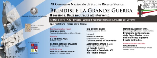 La sezione di Brindisi della Società di Storia Patria per la Puglia in uno con la Società Storica di Terra d’Otranto , con l’adesione e la collaborazione di Assoarma Brindisi, ha organizzato un ciclo d’incontri sul tema: “Brindisi e la Grande Guerra “. L’itinerario di studi sarà suddiviso in tre panels: politico, militare e di relazioni internazionali. Dopo l’incontro introduttivo dello scorso 15 ottobre si proporrà ora di ripensare, in maniera critica, il periodo della neutralità italiana, ricollocandolo a pieno titolo nella storia della Prima guerra mondiale e esaminando i vari aspetti che caratterizzarono l’Italia dalla dichiarazione di neutralità all’intervento in guerra. Molteplici i riferimenti: al sistema politico italiano, con particolare riferimento a vertici istituzionali, forze parlamentari e politiche, correnti d’opinione, stampa e associazionismo; alla situazione delle forze armate italiane alla vigilia del conflitto, preparazione militare, mobilitazione industriale, esercito e opinione pubblica; alla neutralità italiana e al peso del suo intervento militare nel sistema delle alleanze e nella considerazione delle principali potenze belligeranti. Particolarissimo interesse ha, per quel che concerne Brindisi, la complessiva strategia navale italiana; il ruolo del porto si configura quale essenziale nel momento in cui l’Italia, scendendo in guerra a fianco dell’Intesa, deve affrontare il pericolo costituito dalla flotta austroungarica, alla fonda nei sicuri porti adriatici della sponda balcanica.