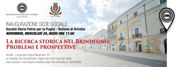 La sezione di Brindisi della Società di Storia Patria per la Puglia è lieta di annunciare la data di inaugurazione della sede operativa: il giorno 29 novembre 2017, alle ore 17.00. La Società ha lo scopo di raccogliere e studiare, anche d’intesa con la Regione Puglia e le altre amministrazioni locali, le tradizioni storiche regionali. Essa si propone di tutelare il patrimonio storico pugliese, interponendo la propria autorità e l’opera dei soci a difesa delle ricchezze bibliografiche, archivistiche, monumentali, archeologiche, artistiche e demo-etno-antropologiche minacciate e trascurate; così come coopera allo sviluppo della cultura storica e degli istituti che ad essa attendono nella Regione. La Società, per volontà di legge esprime pareri sulla toponomastica stradale dei Comuni della Regione stessa.