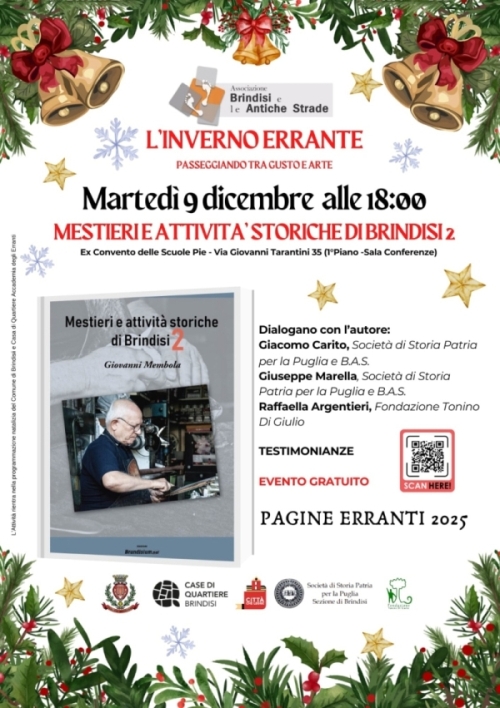 L’incontro si terrà martedì 9 dicembre alle ore 18 presso la sala conferenze della Casa di Quartiere dell’Accademia degli Erranti, in Via Giovanni Tarantini 35 (1°Piano – Ex Convento delle Scuole Pie), dove verrà presentato il libro I Mestieri e le Attività storiche di Brindisi – Volume 2” di Giovanni Membola, a cura di Brundisium.net. Dialogheranno con l’autore: Giacomo Carito, Giuseppe Marella (Società di Storia Patria per la Puglia e Bas) e Raffaella Argentieri (Fondazione Tonino Di Giulio)-