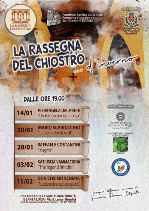 La II edizione invernale de La Rassegna del Chiostro a Brindisi presenta 5 incontri tra letteratura e pittura dal 14 gennaio all’11 febbraio 2026, presso la Chiesa di Santa Lucia alle ore 19:00. L’evento, ideato da Francesca Romana Intiglietta, offre presentazioni di libri accompagnate da esposizioni pittoriche tematiche: le parole dei libri incontrano il colore delle tele, in un dialogo unico tra letteratura ed esposizioni pittoriche tematiche.