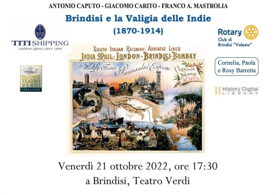 “La via mondiale che, percorrendo l’Italia, riesce a Brindisi e avvicina l’Europa alle Indie, troverà aperti tre varchi alla vaporiera per attraversare le Alpi”, così Vittorio Emanuele II, nel discorso della corona del 1871, evidenziava la ripresa di centralità del Mediterraneo e di Brindisi conseguente l’apertura del canale di Suez. La Valigia delle Indie è termine che ne contiene, si direbbe, molti altri; rappresentò, infatti, a un tempo, un luogo dell’immaginario, un treno che per lusso rivaleggiò con l’Orient-Express, un complesso sistema di trasporti, un itinerario marittimo. Questi significati convergono e hanno fulcro in Brindisi che della Valigia su snodo essenziale rappresentando l’ultima tappa occidentale del percorso che univa Londra a Bombay e, più generalmente, a tutte le colonie inglesi oltre Suez. Ricorrendo il 150° del primo approdo, il 25 ottobre 1870, dei grandi piroscafi a servizio di questo collegamento intercontinentale in Brindisi, la sezione di Brindisi della Società di Storia Patria per la Puglia, in collaborazione con la Società Storica di Terra d’Otranto e il Rotary Club Brindisi Valesio, ha promosso un incontro di studi che ha analizzato quanto la Valigia abbia influito sulle trasformazioni che pure interessarono, sotto ogni aspetto, la città adriatica.
