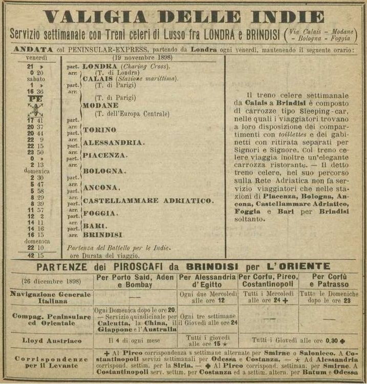 Con l’ultimazione del traforo del Moncenisio il percorso da Londra all’India diveniva ancora più breve e pertanto la P&O stipulò con il governo italiano (1872) una lunga serie di convenzioni postali che per anni registrò un costante aumento del traffico di merci, di posta e di passeggeri nel porto della città pugliese.