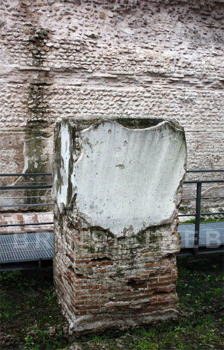 Lungo la base dei muri perimetrali vi sono dei cordoli che servivano ed eludere le infiltrazioni e le perdite d’acqua, ricoperti, nella vasca più grande, dalle lastre della pavimentazione (6). Questi muri sono realizzati con blocchetti irregolari in calcare che si alternano a fasce orizzontali di laterizi.