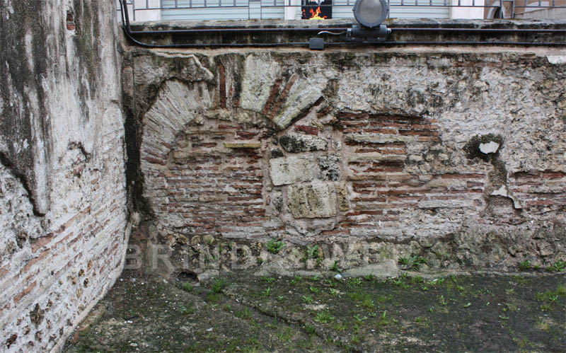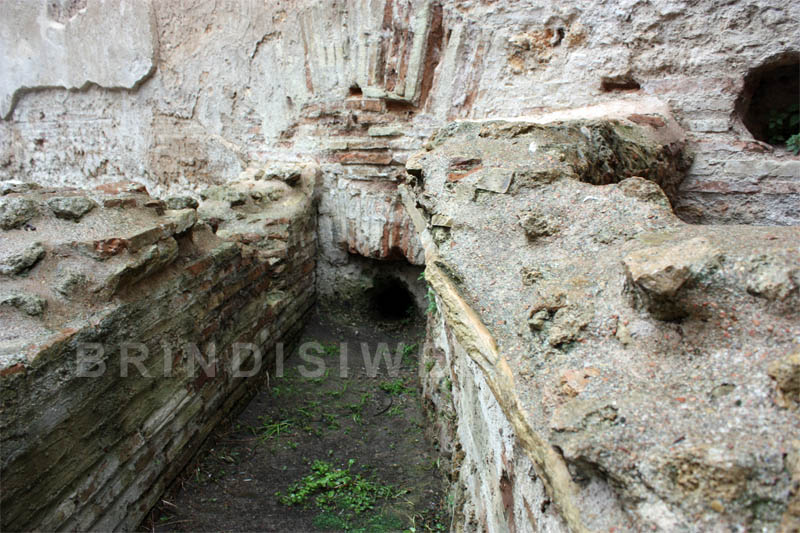 Sull’angolo del muro di fronte è presente un altro arco (5) – anch’esso chiuso – che potrebbe essere stato utilizzato come ulteriore scarico o comunque come apertura per una condotta idrica.