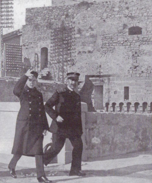 L’altra fotografia mostra l’erede al trono, all’epoca dodicenne e con uniforme da cadetto, su uno dei terrazzi del castello, sempre affiancato dall’onnipresente Bonaldi, dal canonico brindisino Pasquale Camassa e da alcuni ufficiali di marina di stanza al castello, l’interessante scatto è tratto dalla pubblicazione “Brindisi, la sentinella vigile dell’Adriatico” del 1918.