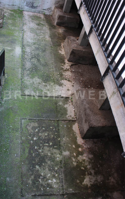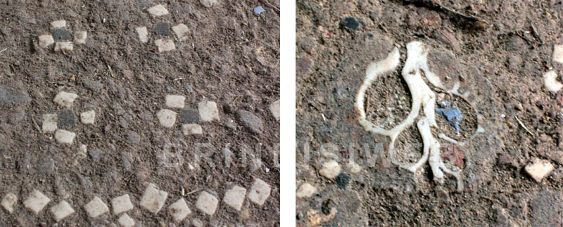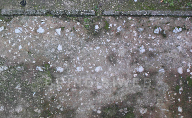 I pavimenti visibili sul lato a ovest, in corrispondenza del cancelletto d’ingresso, consistono in coccio pesto decorato da scaglie (scutulae) bianche a forma irregolare e da scaglie colorate, disposte su file regolari. Sono riquadrati da una soletta in cemento che ne rettifica i limiti1.