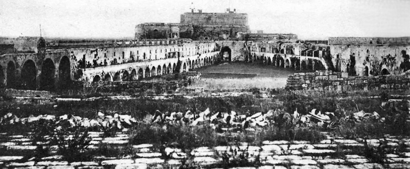 Nel 1558 si avvia la costruzione del forte che si protrarrà per circa 46 anni con l’intervento di alcuni fra i più celebri architetti militari del tempo: Giulio Cesare Falco del S.O.M., fra questi. Il canale aragonese si trasforma in una darsena di collegamento fra nuova ed antica struttura in cui pure si provvede all’adeguamento del grande baluardo circolare di San Filippo, in direzione del porto, e di quello triangolare verso il mare aperto. Il forte, a sua volta separato dalla parte nord dell’isola da un nuovo canale oltre il quale è l’opera a corno, si articola nei bastioni di Tramontana e San Pietro in direzione della città, dell’Intavolata e di Santa Maria sul verso opposto.