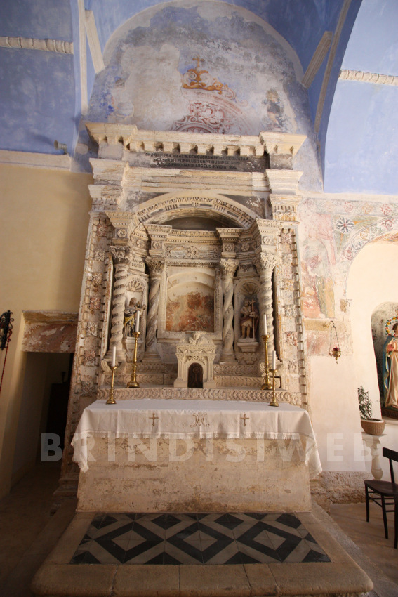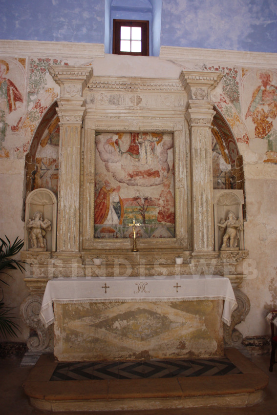 In controfacciata è un’ acquasantiera lapidea, a muro, databile al tardo ‘500 o ai primi del ‘600, dalla vasca circolare ornata da baccellature. Sull’attuale parete di fondo un altare in pietra sei – settecentesco, attuale altar maggiore, in un’ ampia arcata ricavata nel muro, in cui pure sono collocate le rappresentazioni scultoree di due cherubini a figura intera, conserva una decorazione pittorica più antica tardo cinquecentesca o dei primi del seicento, raffigurante una Madonna del Rosario. Tale rappresentazione, chiaro rimando alla battaglia di Lepanto, interdetta alla vista dagli interventi settecenteschi, è stata recuperata nel 1982; così è descritta da Marco Fina: