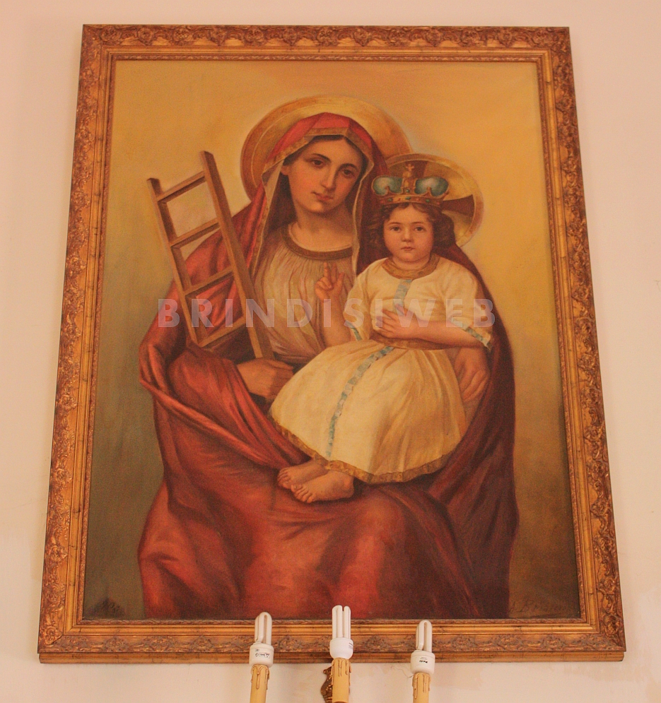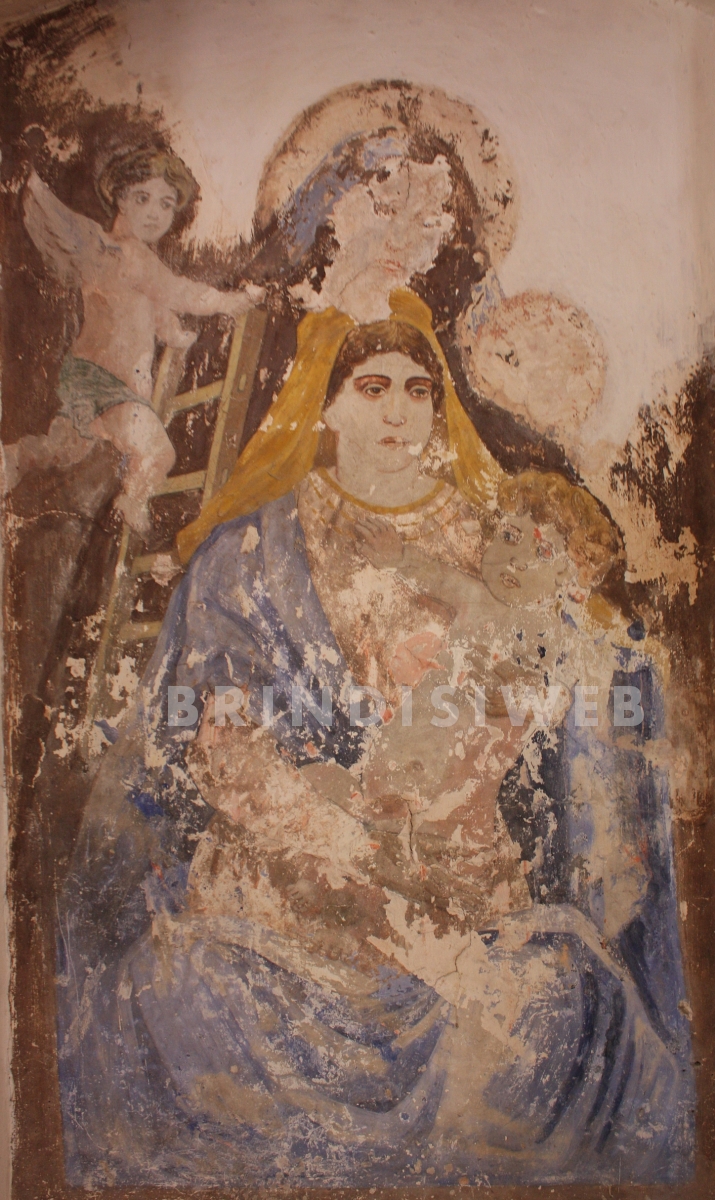 Tra i pochi elementi originali rimasti, vi è la croce in pietra con alla base l’interessante giglio angioino degli Salesi visibile sul timpano della facciata, mentre all’interno, in una piccola nicchia dietro l’altare, si scorge l’affresco della Madonna della Scala (120 × 70 cm), un’opera di autore sconosciuto e datazione indeterminata. Nonostante lo stato non ottimale di conservazione, si possono notare due immagini mariane diverse: quella sottostante più scura e austera, poco leggibile, l’altra molto colorata e vivace, composta da tre figure, l’angelo che si arrampica su una scala (un chiaro riferimento a uno dei simboli della Passione di Cristo), la Vergine con un velo giallo, il manto blu e la veste rosa, mentre cinge sul braccio sinistro il Bambino biondo. La raffigurazione fu occultata probabilmente alla fine dell’800 “poiché ritenuta troppo moderna e popolareggiante”; infatti, l’assenza dell’aureola, la pettinatura e il trucco degli occhi sono elementi che – verosimilmente – furono giudicati poco consoni a una Madonna. Dov’era la nicchia venne posto il dipinto eseguito nel 1903 del prof. Alessandro Briamo su commissione del sindaco Federico Balsamo, un olio su tela raffigurante le medesime Figure Sacre (una nota indica che per il bambino posò Natale Caravaglio). Dopo i restauri la tela fu posizionata sulla parete laterale della chiesetta, mentre l’interno venne arricchito, nel tempo, con alcune opere a tema religioso, più o meno importanti, su tutte la preziosa statua della Madonna del Carmelo con Bambino restaurata nel 1999 da Vincenzo Caiulo, un intervento a cura del Soroptimist International Club di Brindisi.
