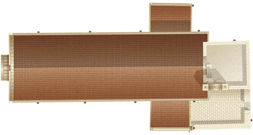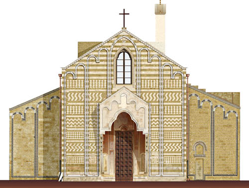 Le fiancate sono scandite anch’esse da lesene saldantesi in alto agli archetti trilobi.