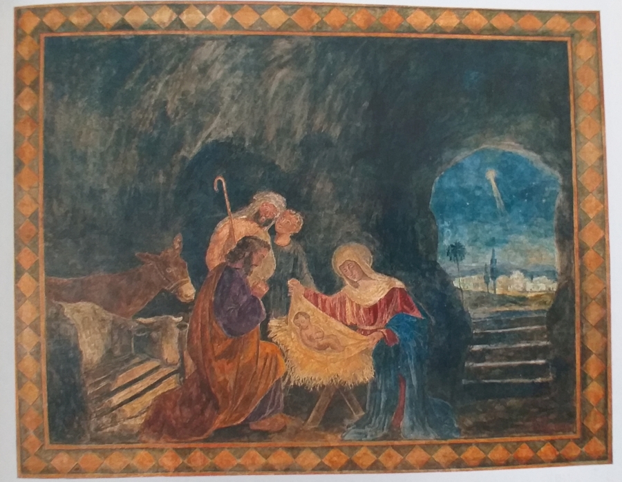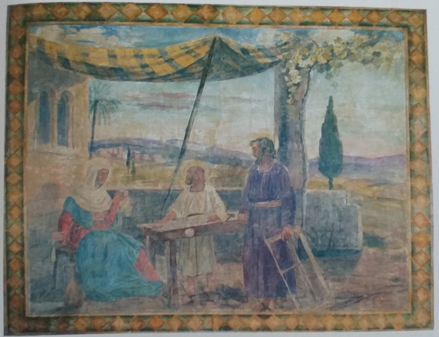 Altre due interessanti opere pittoriche furono portate alla luce durante i lavori di restauro realizzati nel 2003, entrambe firmate dal pittore originario di Trepuzzi Leonardo Perrone: a sinistra è raffigurata la “Natività” mentre sulla parete opposta la “Sacra Famiglia”. Entrambe le opere furono realizzate nel 1948, su commissione della famiglia Mariano, con la tecnica della tempera su intonaco, le scene sono racchiuse in una cornice modulare bicromatica gialla e marrone. L’artista era noto e attivo in tutto il Salento per le rappresentazioni a tema sacro, suoi gli straordinari affreschi in stile tardo rinascimentale che ricoprono interamente le tre navate della chiesa di S. Maria delle Grazie a Squinzano. In realtà, da quanto riportato sui documenti originali del Genio Civile, tutte le decorazioni della chiesa dovevano essere realizzate dal pittore salentino, ma non ci sono elementi per conoscere le modalità di affidamento delle opere principali al cav. Colonna e soprattutto quando e perché le due pitture parietali furono occultate e dimenticate.