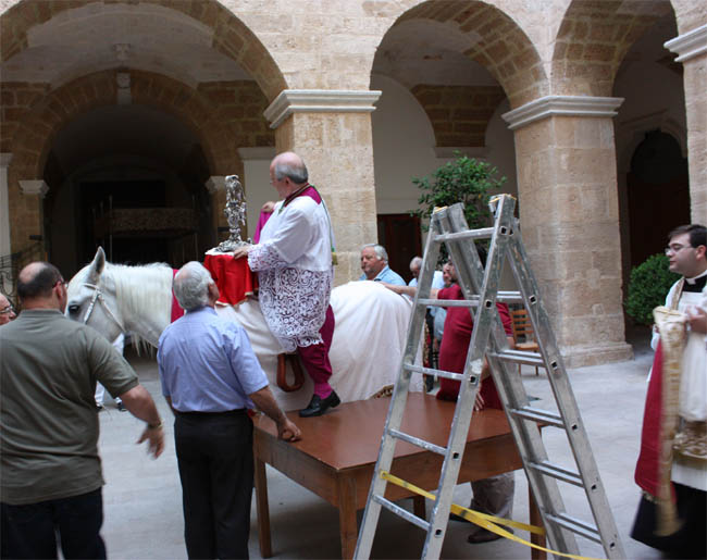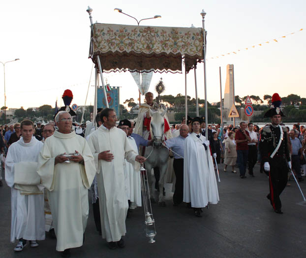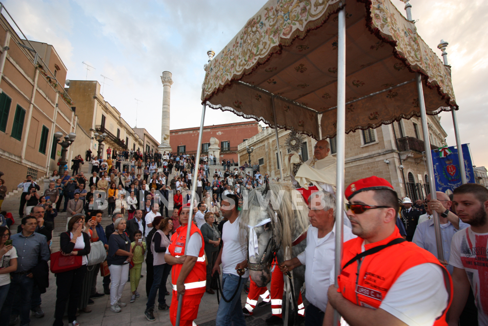 In precedenza lo stesso tragitto, veniva percorso dall’Arcivescovo di Brindisi sul dorso di un cavallo bianco che camminava su un tappeto di petali di fiori e con tanti i balconi riccamente addobbati con drappi e coperte. La folla dei fedeli si assiepava numerosa ai lati delle strade e accompagnava la processione sino al suo rientro in Cattedrale.