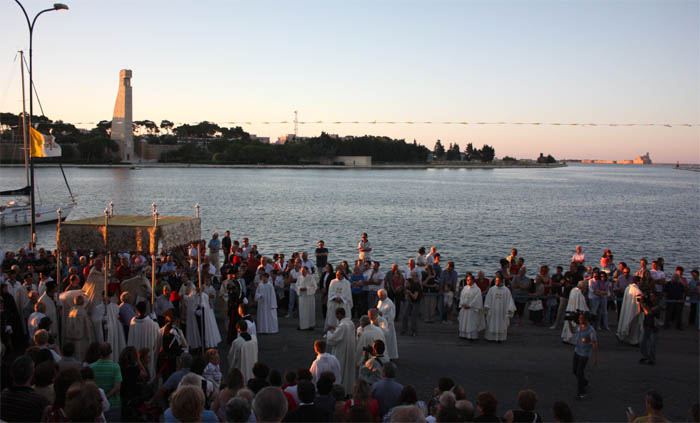 La processione equestre percorreva le strade che conducono sul lungomare. Qui durante il periodo della guerra del 1915-18 – quando il porto era affollato di navi militari – alla cerimonia della benedizione eucaristica, la flotta rispondeva con ventuno salve di artiglieria.