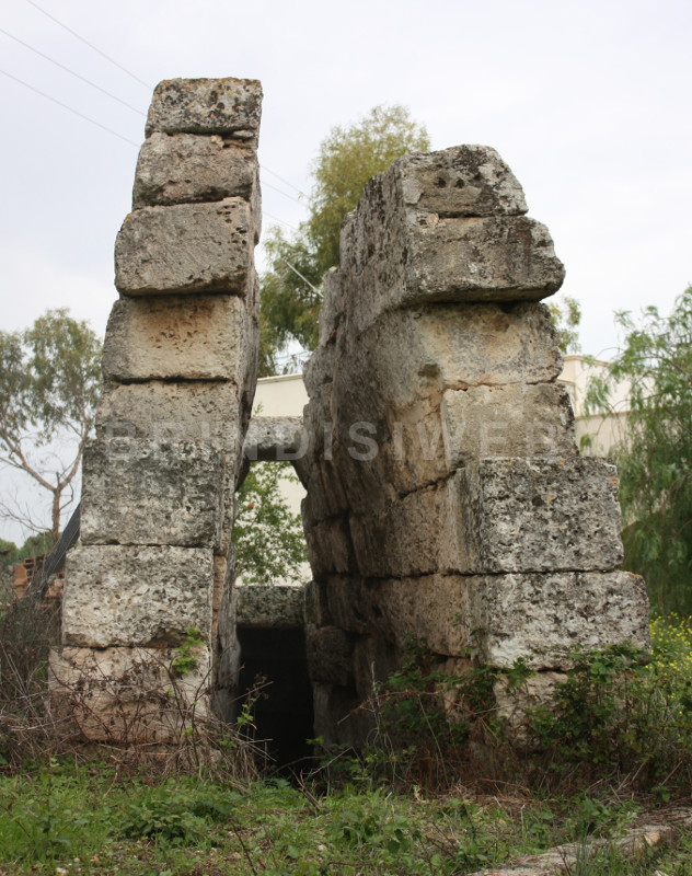 L’ingresso è scavato nella roccia ed è limitato in alto da mura megalitiche, coperte da pietre ad arco.