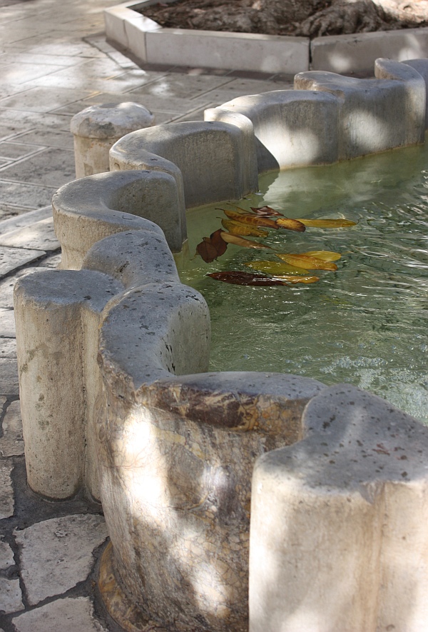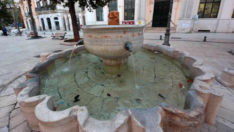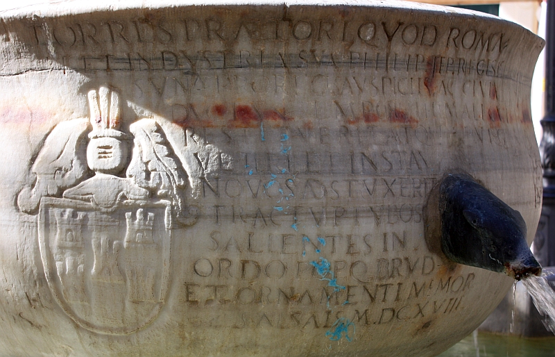 Un’altra scritta latina è risalente al 1792. Sullo stelo mediano al centro della vasca dal quale sgorga l’acqua, si può notare ciò che rimane dello stemma dell’allora sovrano Filippo III di Spagna, ovvero uno scudo racchiuso in un cordone e sormontato da tre elmi, purtroppo deteriorato dal tempo e dallo scorrere dell’acqua. Una volta lo stelo terminava con un capitello ed era cinto da una corona reale.