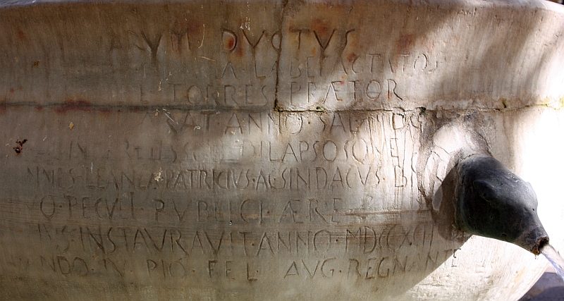 PETRO ALOYSIO DE TORRES PRAETORI: QVOD ROMANOS EMVLATUS AVTHORITATE ET INDVSTRIA SUA/ PHILIPPI TERTII REGIS ET PETRI GIRONIS DVCIS OSSVNAE/ PROREGIS AVSPICIIS AC CIVIVM LABORE ET IMPENSA AQVARUM DVCTVS TEMPORVM ET MALI GVLIELMI INIVRIA DESTRVCTOS RESTITVERIT/ ATQVE REPVRGATO FUNICVLO VETERI ET INSTAVRATO FORNICE NOVOS ADSTRUXERIT/ AC SINVOSO TRACTV PER TVBOS FISTVLAS ET SALIENTES IN VRBE PERTRAXERIT/ ORDO POPVLVSQVE BRVNDVSINVS PARTE COMMODITATIS ET ORNAMENTI MEMOR ET GRATVS POST ANNVM SALVTIS MDCXVIII.