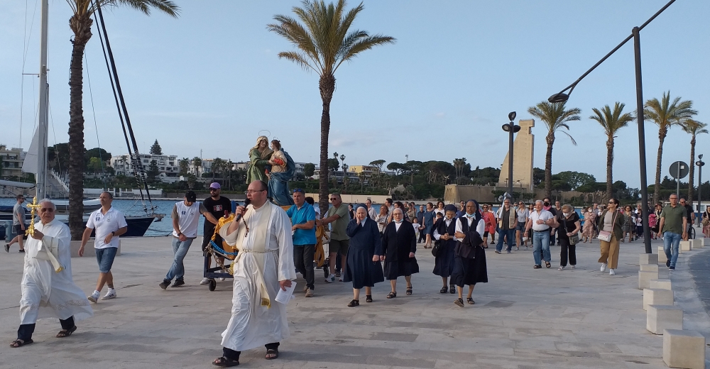 Rarissime sono le fonti a cui poter attingere notizie storiche, anche tra i più anziani “sciabicoti” ancora in vita non è stato semplice trovare una reminiscenza personale di questa remota processione, solo in una poesia in vernacolo di Francesco Libardo, pubblicata nel volume “L’oru ti Brindisi”, si trova una fugace descrizione del rito popolare e si percepisce la profonda devozione degli abitanti del quartiere per “la Matonna ti li piscaturi”. Il fine poeta dialettale nonché profondo cultore delle tradizioni marinare locali, nei suoi versi nostalgici fa rivivere la bella processione del due di luglio, quando la statua veniva condotta alle Sciabiche per restarci tutta la notte, sistemata all’interno di una apposita nicchia, al fianco della quale vigilavano una coppia di “beatelli”. Prima del passaggio del simulacro veniva accesa l’illuminazione “a carburiu” su quattro archi, poi durante la grande festa venivano esplosi fuochi d’artificio, “rotapacci e fisckaruli”, non potevano mancare le bancarelle di fave secche, scapece (piccoli pesci fritti e marinati a strati alterni con mollica di pane imbevuta con aceto e zafferano), noci, castagne cotte al forno e “cornuli” (i baccelli dolci dei carrubi). Per l’occasione il “priore della Chiesa Madre” raccoglieva le offerte dei fedeli, soprattutto quelle donate dai pescatori che uscivano in barca con la lampara, essi lasciavano anche un quarto del guadagno della pesca notturna. L’antico rituale venne interrotto con lo scoppio del secondo conflitto mondiale, poi negli anni ’50 il parroco della Cattedrale don Giuseppe Cavaliere tentò di ripristinare l’evento, promuovendo il gruppo “Pia Unione”, senza però riuscirci. La cerimonia, infatti, si tenne solo quell’anno e non ebbe alcun seguito. Di quell’evento resta solo una bella immagine d’epoca nella quale si vede un folto gruppo di pescatori in posa sorridente ed allegra sul molo delle Sciabiche, con al centro il sacerdote. Con il contributo dei social media si è riusciti a individuare buona parte dei loro nomi, compresa la ‘ngiuria (il soprannome): Premiu para para, Luigi lu casciulu, Cocu banana, Ucciu llalla, Tunatu ti ‘nacchia, Chiccu lu cinesi, Vitucciu bambolina, Aldo settigiacchetti, Luigi lu rapinu, Rafeli pezza ti cantru, Cocu muloni, Giuvanni la cima, Ninu ti pirucca e altri ancora. Una volta trasferiti sulla sponda opposta del porto, i pescatori di Brindisi hanno continuato ad invocare la Vergine Maria come loro guida e protettrice, celebrando la festa dell’Ave Maris Stella.