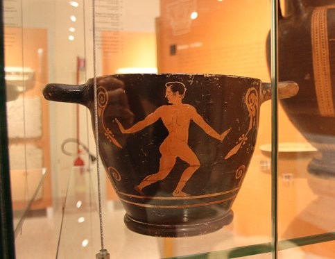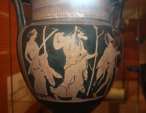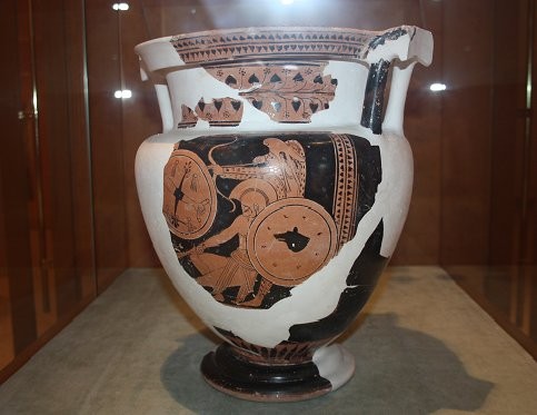 Il reperto più importante è il bellissimo cratere a colonnette (kelebe) decorato a vernice nera con figure rosse. In uno dei due riquadri vi è Dionisio barbato, in lunga tunica a larghe pieghe, preceduto all’altare – che è nel fondo – da satiro avente la cetra fra le mani, seguito da baccante. Mentre sul riquadro opposto si possono osservare tre figure con al centro un giovane virile e ai lati due personaggi barbati avvolti da un mantello, appoggiati entrambi a lunghi bastoni.