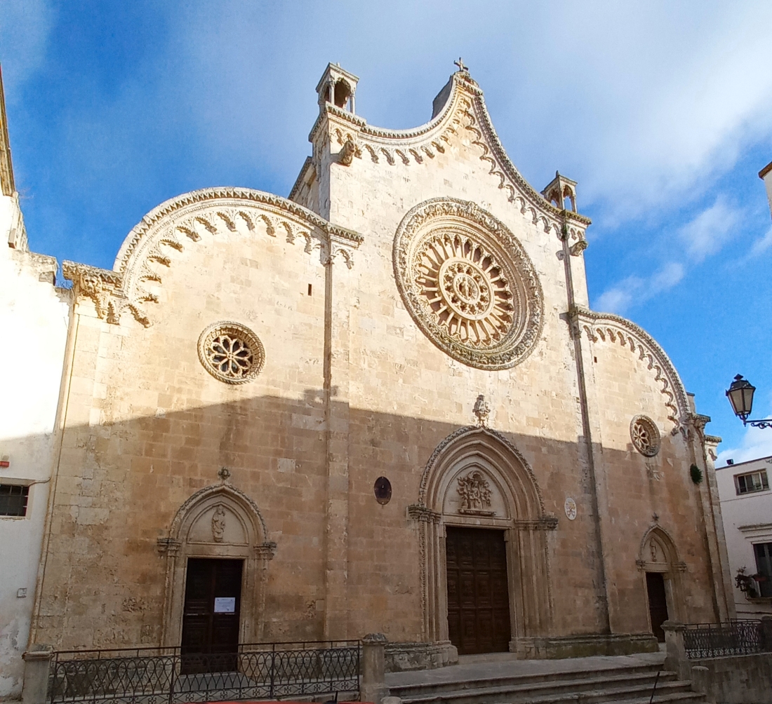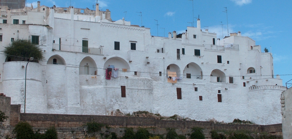 Per difendersi da questi ripetuti assalti nasce la necessità di realizzare una città fortificata, con le sue mura (più volte ricostruite, le attuali risalgono al XIV secolo, ad opera degli angioini con ben 13 torri), con il suo dedalo di vicoli utile a ravvicinare e proteggere i suoi abitanti e che contestualmente frastornava il nemico riuscito a penetrare le mura, che portava all’antico castello normanno sull’apice del nucleo abitato, distrutto durante una delle tante lotte contro l’invasore, rimpiazzato nel XV secolo dalla Cattedrale, uno dei più mirabili esempi di stile tardo gotico nella provincia brindisina.