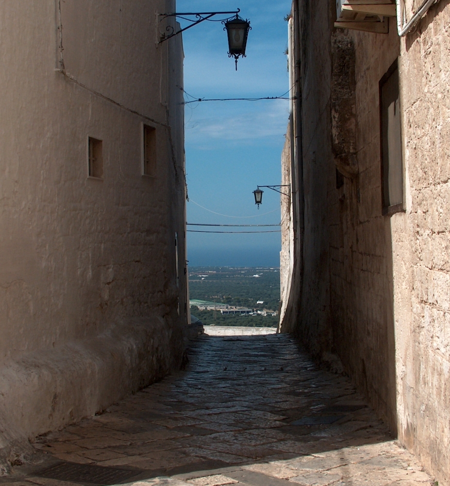 Addentrarsi nel suo cuore, meglio se guidati, si rivela un’esperienza necessariamente ricca di emozione, come diversamente non potrebbe essere, passando tra angusti viottoli spesso lastricati a chianche, tra le case bianche dell’umile volgo d’un tempo ed i palazzotti signorili dai bellissimi e decorati portali, con araldiche, colonne, decorazioni, architravi, mensole e loggiati che arricchiscono questi eleganti palazzotti di stile rinascimentale o rococò di particolari eterni e silenziosi della pietra. Nel silenzio dei vicoli si incrociano terrazze dalla cui altura si gode d’una visuale mozzafiato verso il vicino mare.