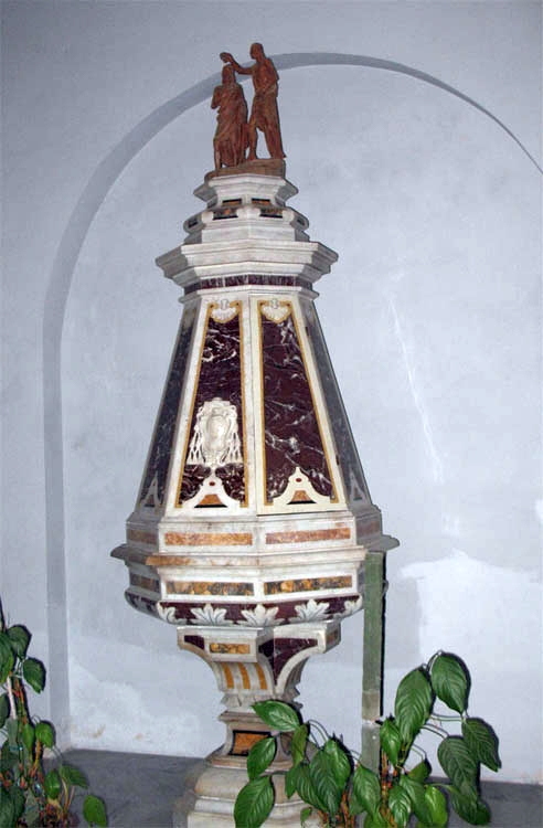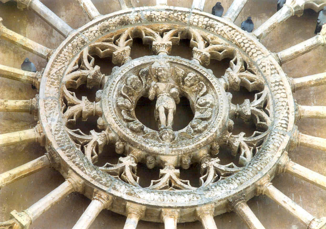 Dal ritmo del sette della ghiera più interna si passa a quello del dodici sulla mediana e del ventiquattro sull’esterna con chiari riferimenti simbolici e rimandi allegorici sui temi del tempo, delle umane opere, dei giorni intersecantesi con altri riferibili alla numerologia vetero e neo testamentaria. Sulle lunette degli ingressi laterali sono i bassorilievi, sulla destra, di San Giovanni Battista e, sulla sinistra, di San Biagio che ha nella destra Ostuni rimarcando la sua funzione di defensor urbis.