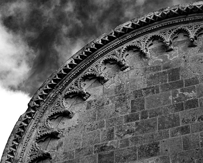 La sua facciata, rivolta a ovest, con elementi del linguaggio gotico e persistenze ancora romaniche, tripartita da agili lesene, ha il suo fulcro, si direbbe. nel grande rosone centrale in cui l’irradiamento muove dal Cristo Salvator Mundi attorniato da sette cherubini.